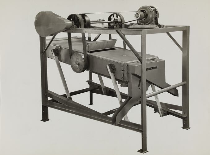 Printed on the front of photograph: '43517-1' Printed in black ink on back of photograph: 'SECTION NO. / SCHUMACHER MILL FURNISHING WORKS PTY. LTD. / GRAHAM ST. PORT MELBOURNE' Handwritten in grey pencil on the back of photograph: '19-M' Handwritten in red pencil on the back of photograph: 'OFFICE COPY' Handwritten in black ink on the back of photograph: 'Vibratory Sifter - / to O/N 43517 - 29/4/43.' Printed in purple ink on back of photograph: 'Kerr / BROS. / COMMERCIAL / PHOTOGRAPHERS / 533 COLLINS ST. MELBOURNE'