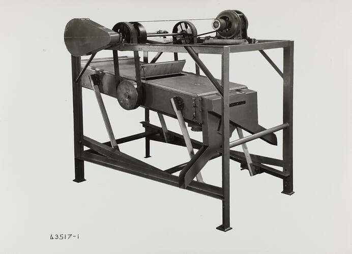 Black and white promotional image of a vibratory sifter. It is part of a collection of photographs and marked printer's copy used in the preparation of trade literature promoting products manufactured by the Schumacher Mill Furnishing Works Pty Ltd. The items were originally housed in a wooden filing drawer, with many filed by subject. This photograph was previously filed under 'MILK POWDER'.