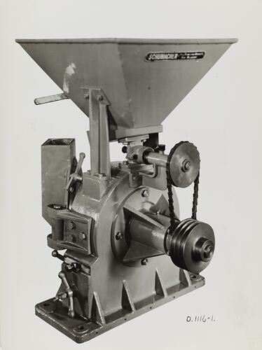Printed on the front of photograph: 'D.1116-1.' Printed in purple ink on the back of photograph: 'Kerr / BROS. / COMMERCIAL / PHOTOGRAPHERS / 533 COLLINS ST. MELBOURNE' Printed in red ink on the back of photograph: 'PHOTO FILE NO / SECTION NO' Handwritten in red pencil on the back of photograph: 'OFFICE COPY' Handwritten in grey pencil on the back of photograph: '10-B' Handwritten in black ink on the back of photograph: 'No.90' Printed in black ink on cream label attached to back of photograph: 'From / Schumacher Mill Furnishing Works / PROPRIETARY LIMITED. / PORT MELBOURNE, / VICTORIA.' Printed in red ink on cream label attached to back of photograph: '3. off swing-hammer heavy duty / "Hercules" screen-type No. 1-A. / Grinders, with special type grid / bar screens in 2 sections - / supplied to O.N.41138 - dated / 24/7/41.'