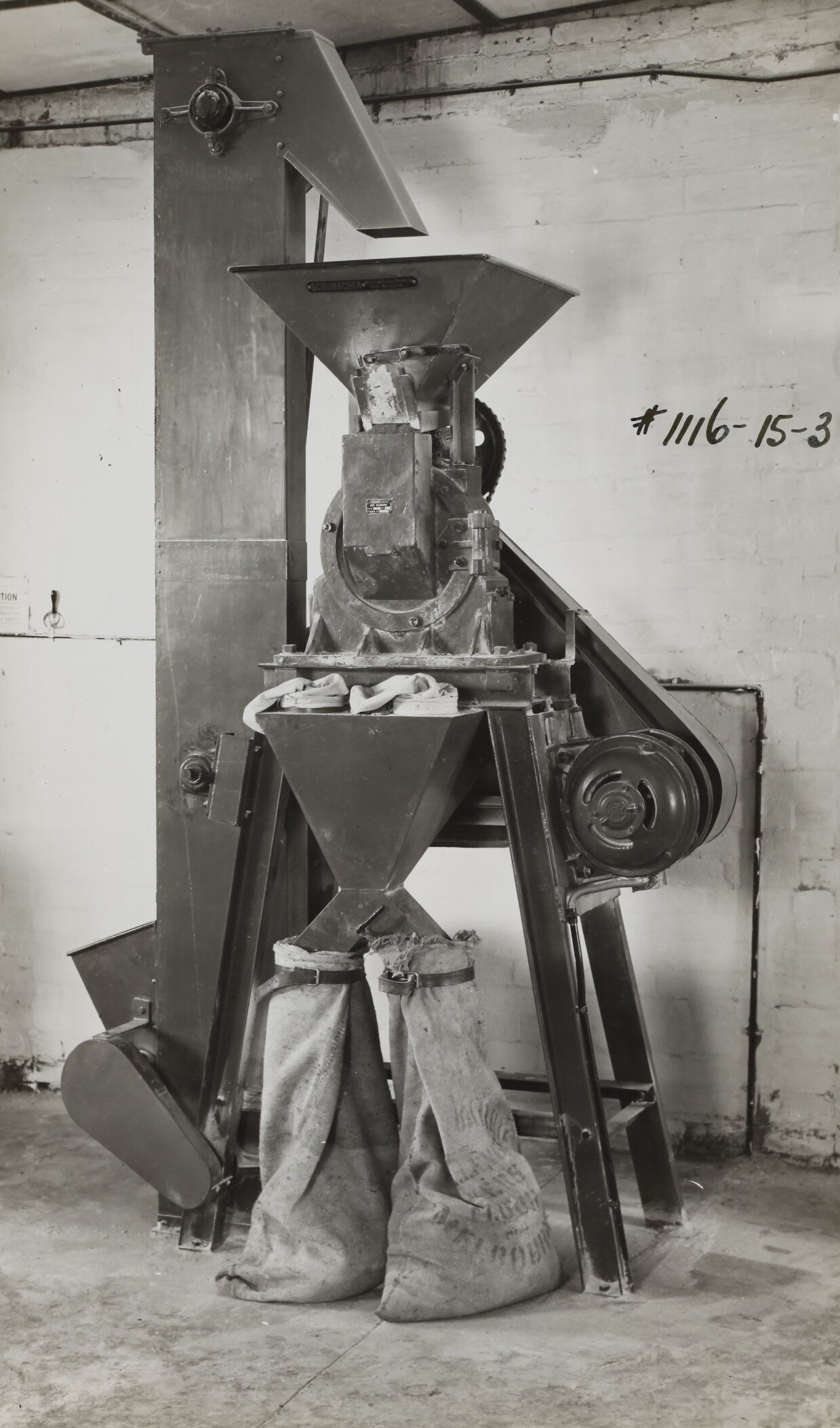 Handwritten in black ink on the front of photograph: '#1116-15-3' Printed in black ink on the back of photograph: 'SCHUMACHER MILL FURNISHING WORKS PTY. LTD. / GRAHAM ST. PORT MELBOURNE. / S. C. 7 VICTORIA. / TELEPHONE MX 2171 / SCHUMACHER MILL FURNISHING WORKS PTY. LTD. / GRAHAM ST. PORT MELBOURNE. / S. C. 7' Printed in red ink on the back of photograph: 'NO. 1-A HERCULES MILL'