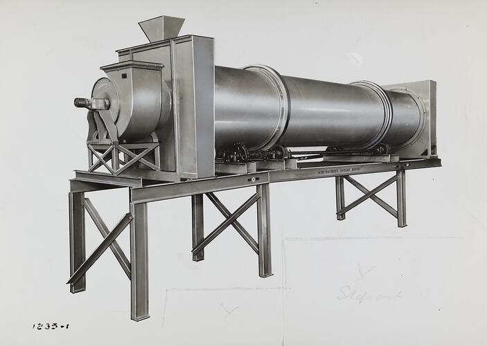 Black and white promotional image of a rotary dryer. It is part of a collection of photographs and marked printer's copy used in the preparation of trade literature promoting products manufactured by the Schumacher Mill Furnishing Works Pty Ltd. The items were originally housed in a wooden filing drawer, with many filed by subject. This photograph was previously filed under 'Drying'.