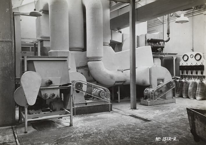 Black and white image depicting industrial machinery. It is part of a collection of photographs and marked printer's copy used in the preparation of trade literature promoting products manufactured by the Schumacher Mill Furnishing Works Pty Ltd. The items were originally housed in a wooden filing drawer, with many filed by subject. This photograph was previously filed under 'Drying'.