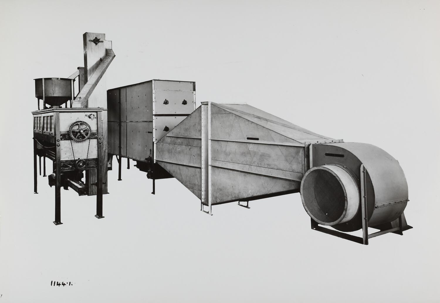 Black and white promotional image of a machine. It is part of a collection of photographs and marked printer's copy used in the preparation of trade literature promoting products manufactured by the Schumacher Mill Furnishing Works Pty Ltd. The items were originally housed in a wooden filing drawer, with many filed by subject. This photograph was previously filed under 'Drying'.