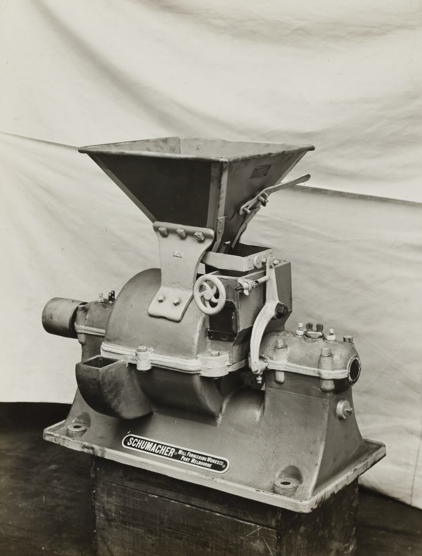 The Schumacher Mill Furnishing Works of Port Melbourne was established by the German-born American immigrant Otto Charles Schumacher around 1890. Operating initially under the name Otto C. Schumacher, the firm specialised in the importation, manufacture, installation and repair of flourmilling equipment, especially the newer style roller flour grinding machines, and associated equipment such as flour sifters, pollard and bran extractors, dust collectors, grain elevators and bag fillers. The business was formally registered as the Schumacher Mill Furnishing Works Pty Ltd in 1910. In later years the firm diversified into the manufacture of grain grading machinery for farmers and more general manufacturing equipment such as grinding mills, conveyors and packaging machinery.