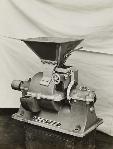 Black and white promotional image of a Schumacher grinding mill machine in factory. It is part of a collection of photographs and marked printer's copy used in the preparation of trade literature promoting products manufactured by the Schumacher Mill Furnishing Works Pty Ltd. The items were originally housed in a wooden filing drawer, with many filed by subject. This photograph was previously filed under 'MISC'.