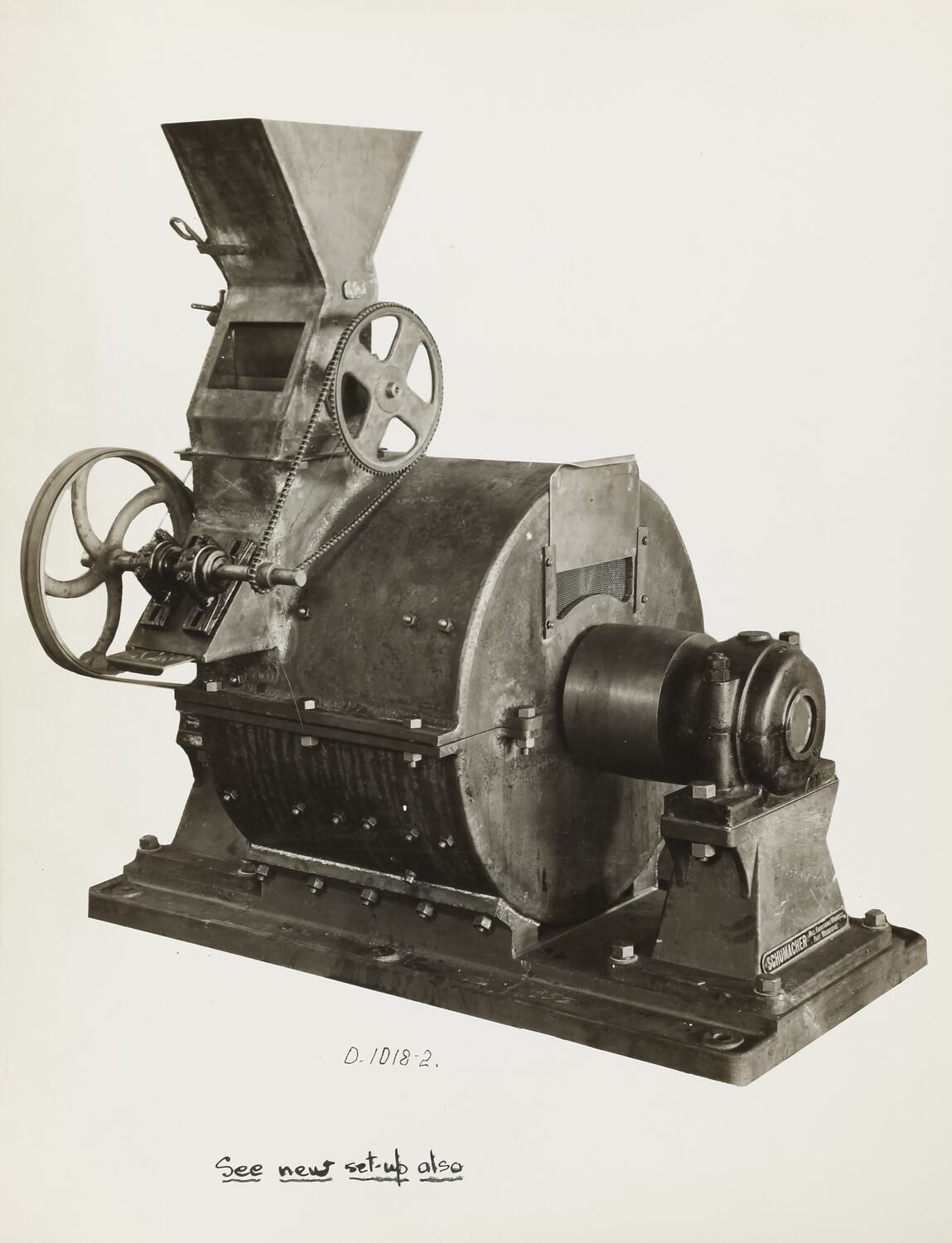Black and white promotional image of a disc mill machine. It is part of a collection of photographs and marked printer's copy used in the preparation of trade literature promoting products manufactured by the Schumacher Mill Furnishing Works Pty Ltd. The items were originally housed in a wooden filing drawer, with many filed by subject. This photograph was previously filed under 'Disc Mills'.