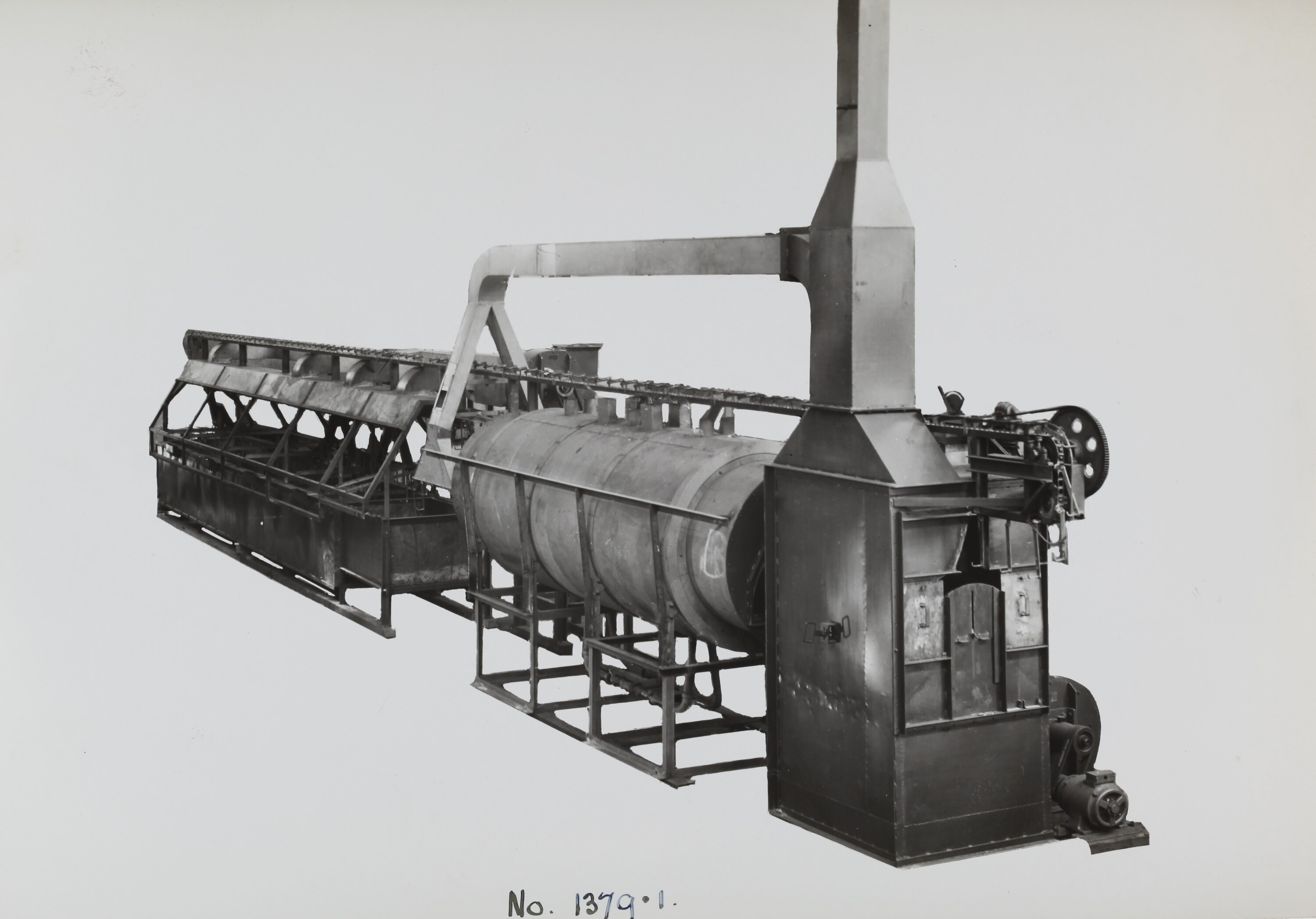 Printed in black on front of photograph: 'No. 1379-1.' Printed in black ink on back of photograph: 'Kerr / BROS. / COMMERCIAL / PHOTOGRAPHERS / 533 COLLINS ST. MELBOURNE' Printed in red ink on back of photograph: 'OFFICE COPY' Printed in black ink on back of photograph: 'LOADING AND UNLOADING TABLES, COMBINATION DETERGENT, / WASHING & ENAMELLING BATHS, FUME HOOD, GAS BURNERS, / FAN, DUCTWORK, AIR COOLER, CONVEYING ASSEMBLY AND / CHAIN TRACK, CONVEYOR CHAIN DRIVE ETC. / SUPPLIED TO ORDER 46341.'