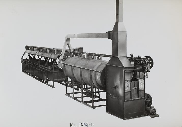 Black and white promotional image of a machine. It is part of a collection of photographs and marked printer's copy used in the preparation of trade literature promoting products manufactured by the Schumacher Mill Furnishing Works Pty Ltd. The items were originally housed in a wooden filing drawer, with many filed by subject. This photograph was previously filed under 'Drying'.