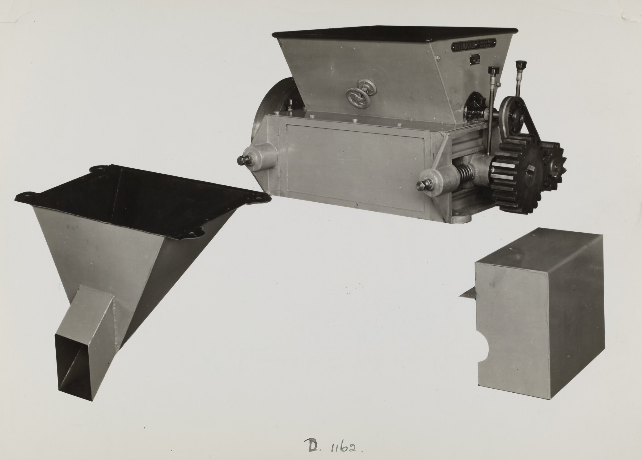 Black and white promotional image of a Pyramid-Tooth cracking machine. It is part of a collection of photographs and marked printer's copy used in the preparation of trade literature promoting products manufactured by the Schumacher Mill Furnishing Works Pty Ltd. The items were originally housed in a wooden filing drawer, with many filed by subject. This photograph was previously filed under 'MISC'.