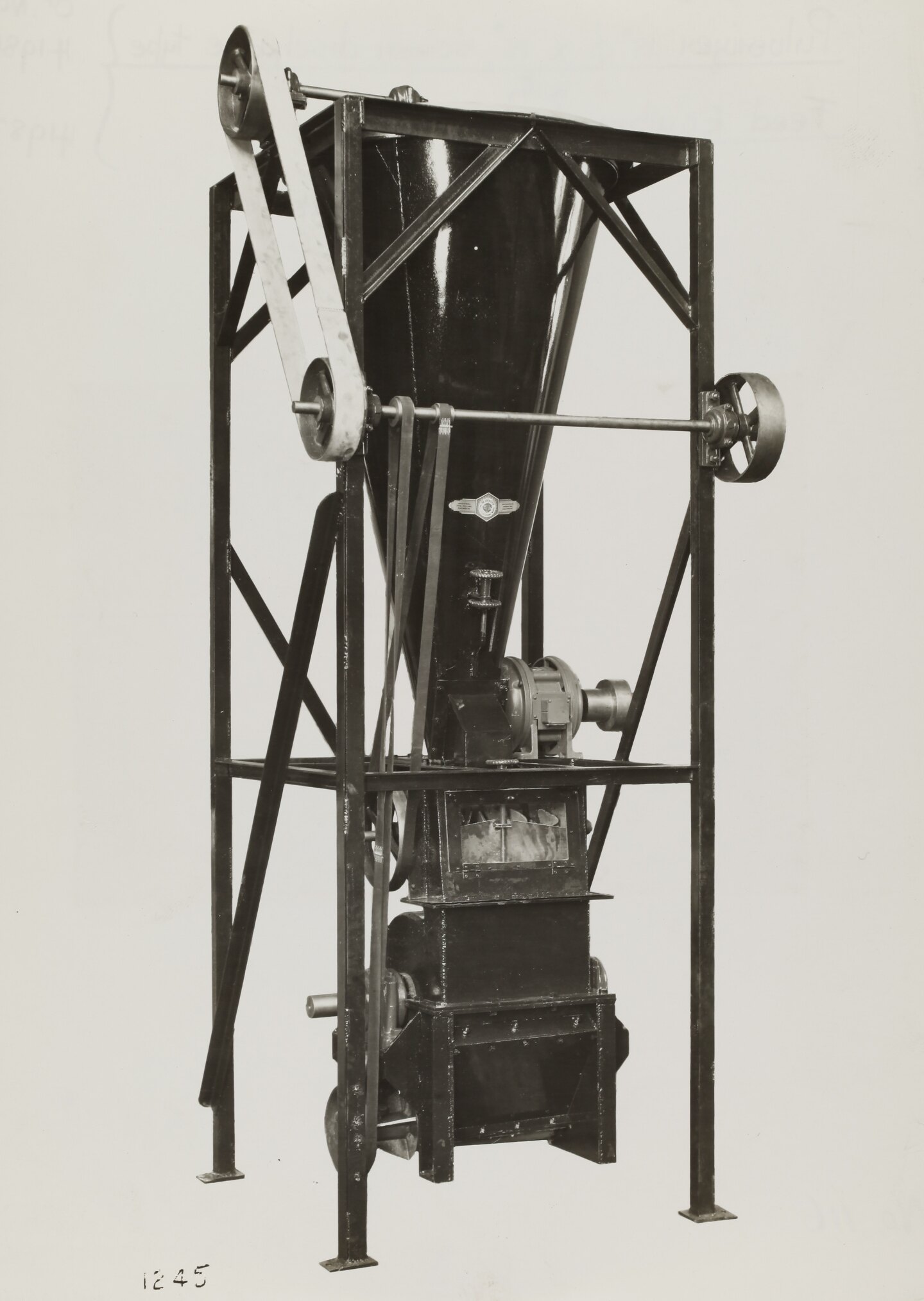 Printed on the front of photograph: '1245' Printed in purple ink on the back of photograph: 'Kerr / BROS. / COMMERCIAL / PHOTOGRAPHERS / 533 COLLINS ST. MELBOURNE' Handwritten in black ink on the back of photograph: 'Pulverizer 18" X 18" , screen discharge type / with / Feed Equipment / 2-Feb-1942. / Or. No. / 41986 / 41987 / No. 116' Printed in black ink on cream label attached to back of photograph: 'From / Schumacher Mill Furnishing Works / PROPRIETARY LIMITED. / PORT MELBOURNE, / VICTORIA.'