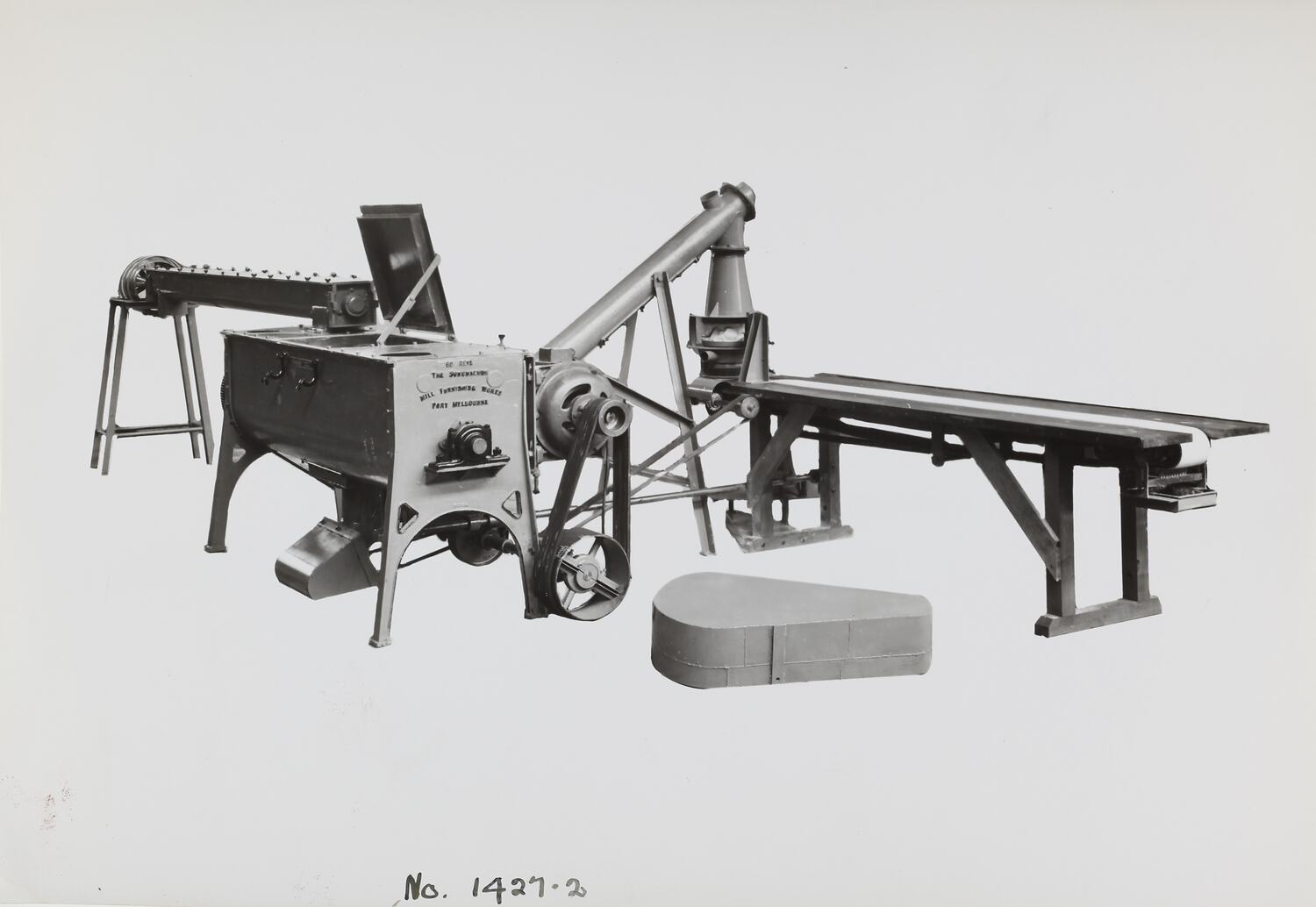 Printed in black on front of photograph: 'No. 1427-2' Printed in black ink on back of photograph: 'Kerr / BROS. / COMMERCIAL / PHOTOGRAPHERS / 533 COLLINS ST. MELBOURNE' Printed in red ink on back of photograph: 'OFFICE COPY' Printed in black ink on back of photograph: 'POWDER ARSENATE LEAD PLANT EQUIPMENT... / HORIZONTAL SCREW CONVEYOR, NO. 14 MIXER SIFTER, / SCREW ELEVATING CONVEYOR, TRAVELLING AND STATIONARY / TABLE, SPILLAGE BOX ETC. / SUPPLIED TO ORDER 47356.'
