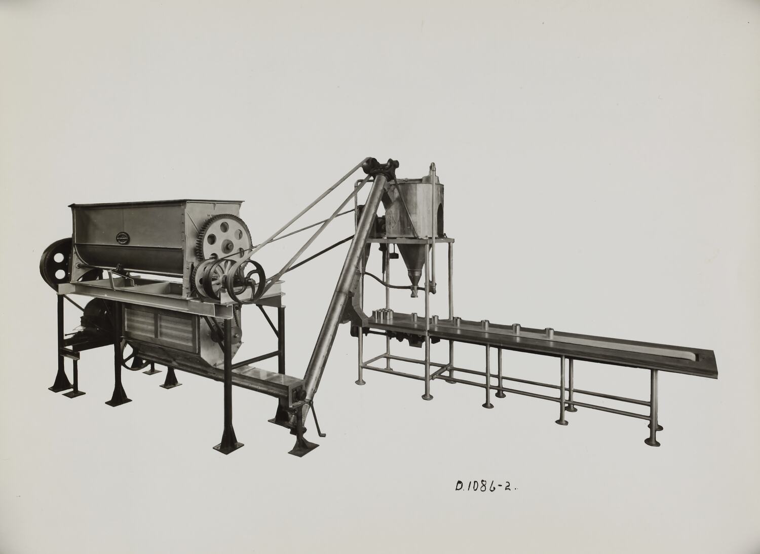 Black and white promotional image of a mixing, sifting, conveying and packing self contained plant. It is part of a collection of photographs and marked printer's copy used in the preparation of trade literature promoting products manufactured by the Schumacher Mill Furnishing Works Pty Ltd. The items were originally housed in a wooden filing drawer, with many filed by subject. This photograph was previously filed under 'Automatic (Milk Powder)'.