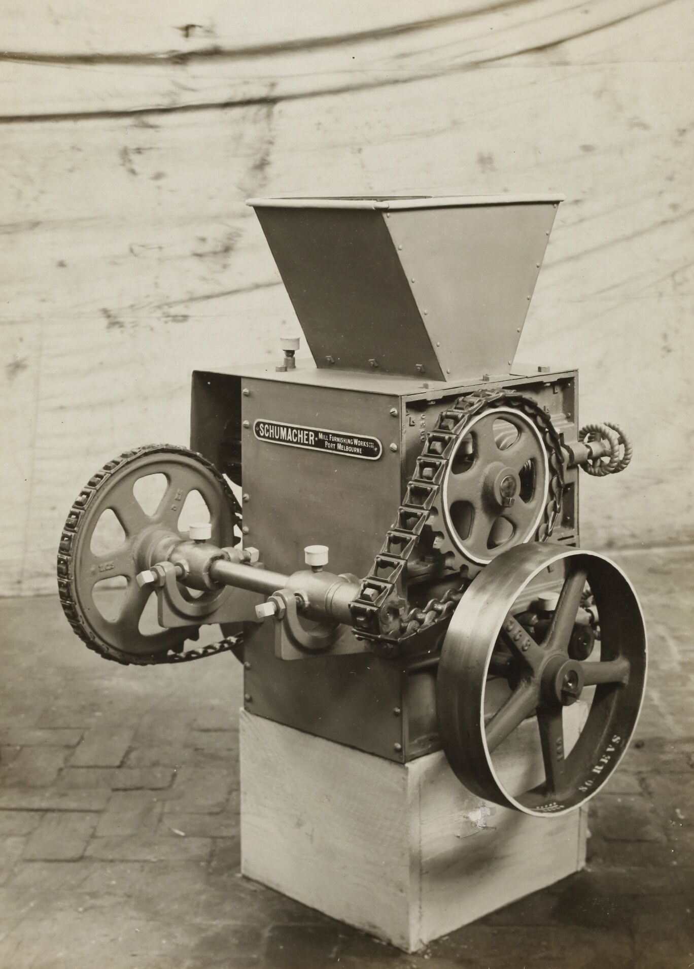 The Schumacher Mill Furnishing Works of Port Melbourne was established by the German-born American immigrant Otto Charles Schumacher around 1890. Operating initially under the name Otto C. Schumacher, the firm specialised in the importation, manufacture, installation and repair of flourmilling equipment, especially the newer style roller flour grinding machines, and associated equipment such as flour sifters, pollard and bran extractors, dust collectors, grain elevators and bag fillers. The business was formally registered as the Schumacher Mill Furnishing Works Pty Ltd in 1910. In later years the firm diversified into the manufacture of grain grading machinery for farmers and more general manufacturing equipment such as grinding mills, conveyors and packaging machinery.