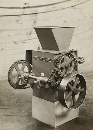 Black and white image of a machine. It is part of a collection of photographs and marked printer's copy used in the preparation of trade literature promoting products manufactured by the Schumacher Mill Furnishing Works Pty Ltd. The items were originally housed in a wooden filing drawer, with many filed by subject. This photograph was previously filed under 'MISC'.