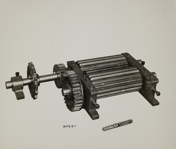 Black and white promotional image of a roll crushing machine. It is part of a collection of photographs and marked printer's copy used in the preparation of trade literature promoting products manufactured by the Schumacher Mill Furnishing Works Pty Ltd. The items were originally housed in a wooden filing drawer, with many filed by subject. This photograph was previously filed under 'PERPLEX'.
