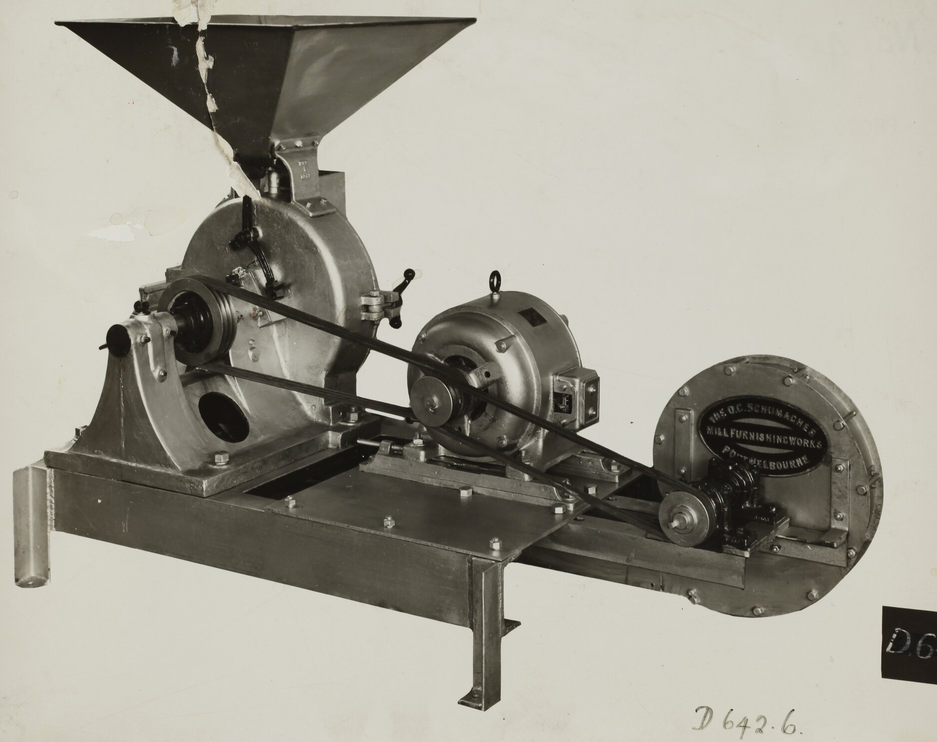The Schumacher Mill Furnishing Works of Port Melbourne was established by the German-born American immigrant Otto Charles Schumacher around 1890. Operating initially under the name Otto C. Schumacher, the firm specialised in the importation, manufacture, installation and repair of flourmilling equipment, especially the newer style roller flour grinding machines, and associated equipment such as flour sifters, pollard and bran extractors, dust collectors, grain elevators and bag fillers. The business was formally registered as the Schumacher Mill Furnishing Works Pty Ltd in 1910. In later years the firm diversified into the manufacture of grain grading machinery for farmers and more general manufacturing equipment such as grinding mills, conveyors and packaging machinery.