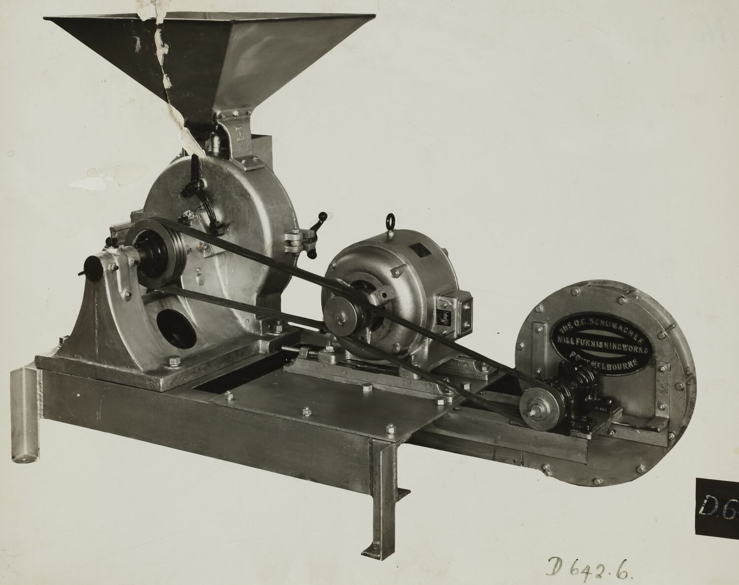 Handwritten in black on the front of photograph: 'D.642-6' Printed in black ink on the back of photograph: 'NO.2 HERCULES MILL, with pick-up Fan.' Handwritten in black ink on back of photograph: 'No. 40' Printed in red ink on the back of photograph: 'PHOTO FILE NO. / SECTION NO. / SUPPLIED TO MONSANTO PTY LTD.' Handwritten in grey pencil on the back of photograph: '10 B' Handwritten in red pencil on the back of photograph: 'OFFICE / Copy' Printed in purple ink on back of photograph: 'Kerr / BROS. / COMMERCIAL / PHOTOGRAPHERS / 533 COLLINS ST. MELBOURNE'