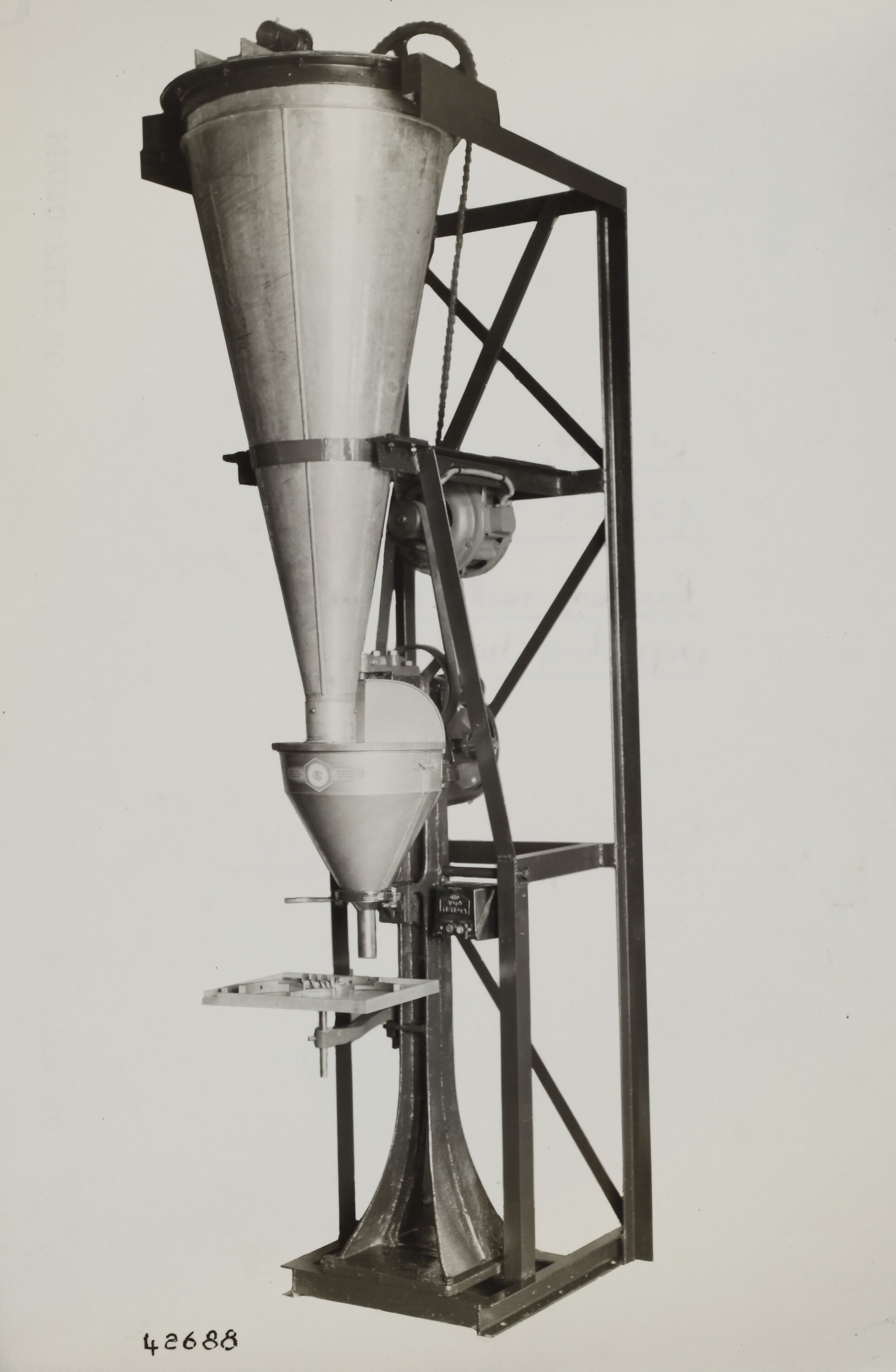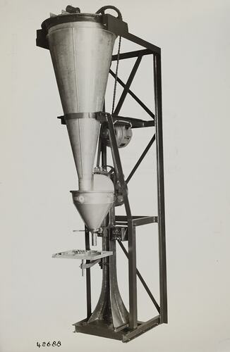 Printed in black on front of photograph: '42688' Printed in purple ink on back of photograph: 'Kerr / BROS. / COMMERCIAL / PHOTOGRAPHERS / 533 COLLINS ST. MELBOURNE' Hand written in grey pencil on back of photograph: '8-B' Hand written in red pencil on back of photograph: 'OFFICE COPY' Printed in red ink on back of photograph: 'PHOTO FILE NO. / SECTION NO.' Hand written in black ink on back of photograph: 'Or. No. / 42688 / Packer, with screw / agitating hopper.'