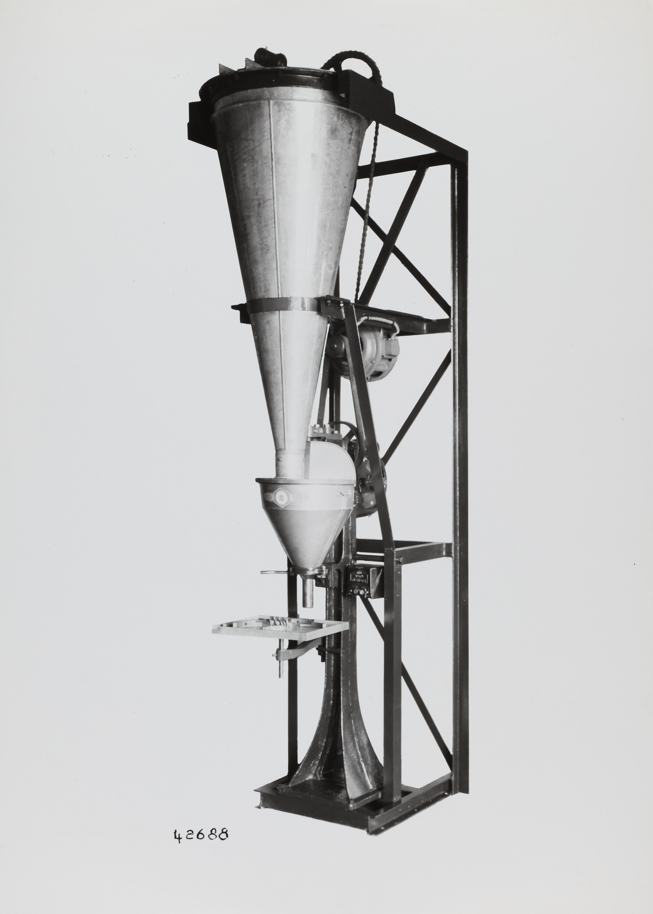 Black and white promotional image of a packing machine with screw agitating hopper. It is part of a collection of photographs and marked printer's copy used in the preparation of trade literature promoting products manufactured by the Schumacher Mill Furnishing Works Pty Ltd. The items were originally housed in a wooden filing drawer, with many filed by subject. This photograph was previously filed under 'Triumph'.
