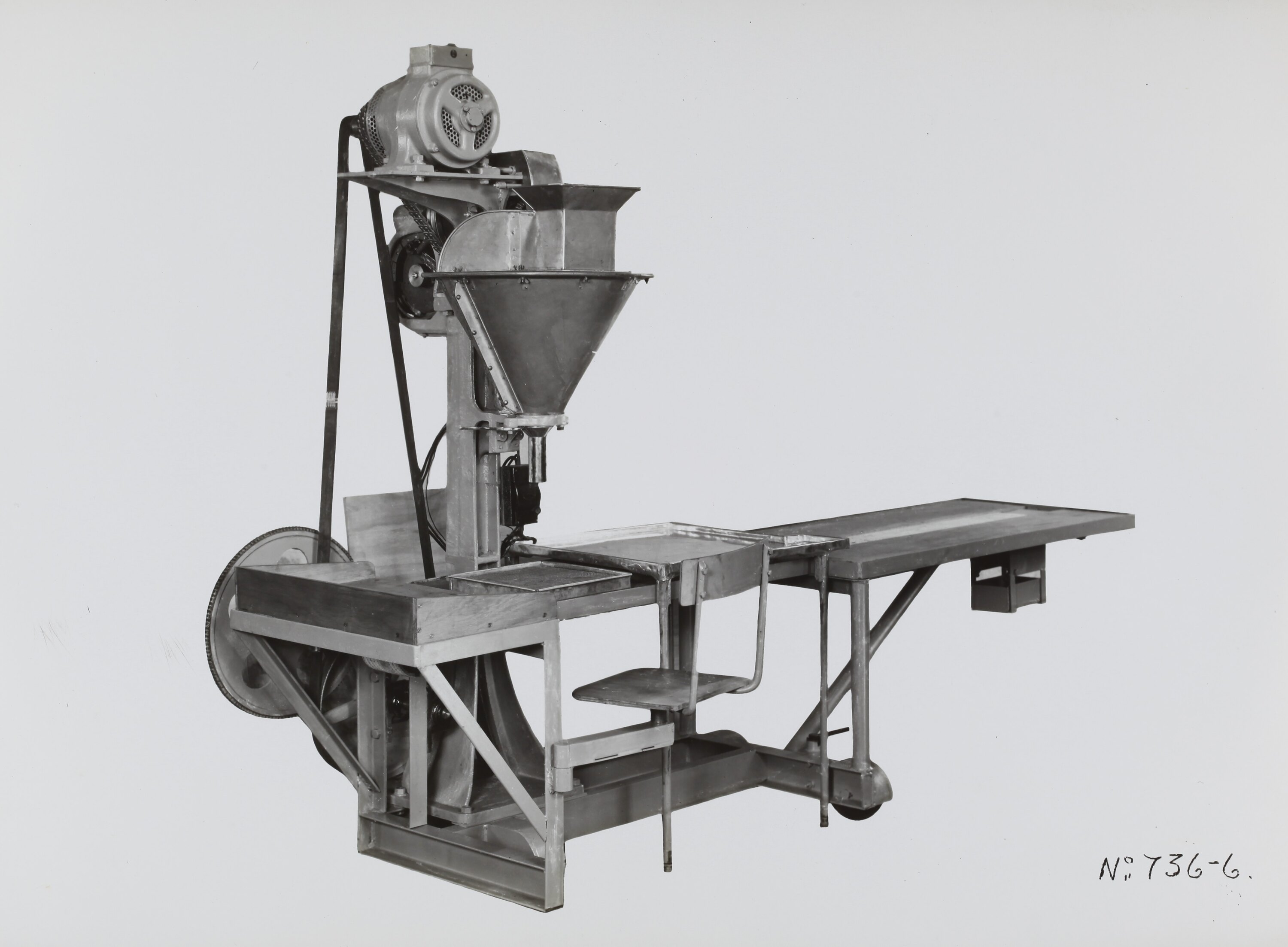 Black and white promotional image of a machine. It is part of a collection of photographs and marked printer's copy used in the preparation of trade literature promoting products manufactured by the Schumacher Mill Furnishing Works Pty Ltd. The items were originally housed in a wooden filing drawer, with many filed by subject. This photograph was previously filed under 'Triumph'.