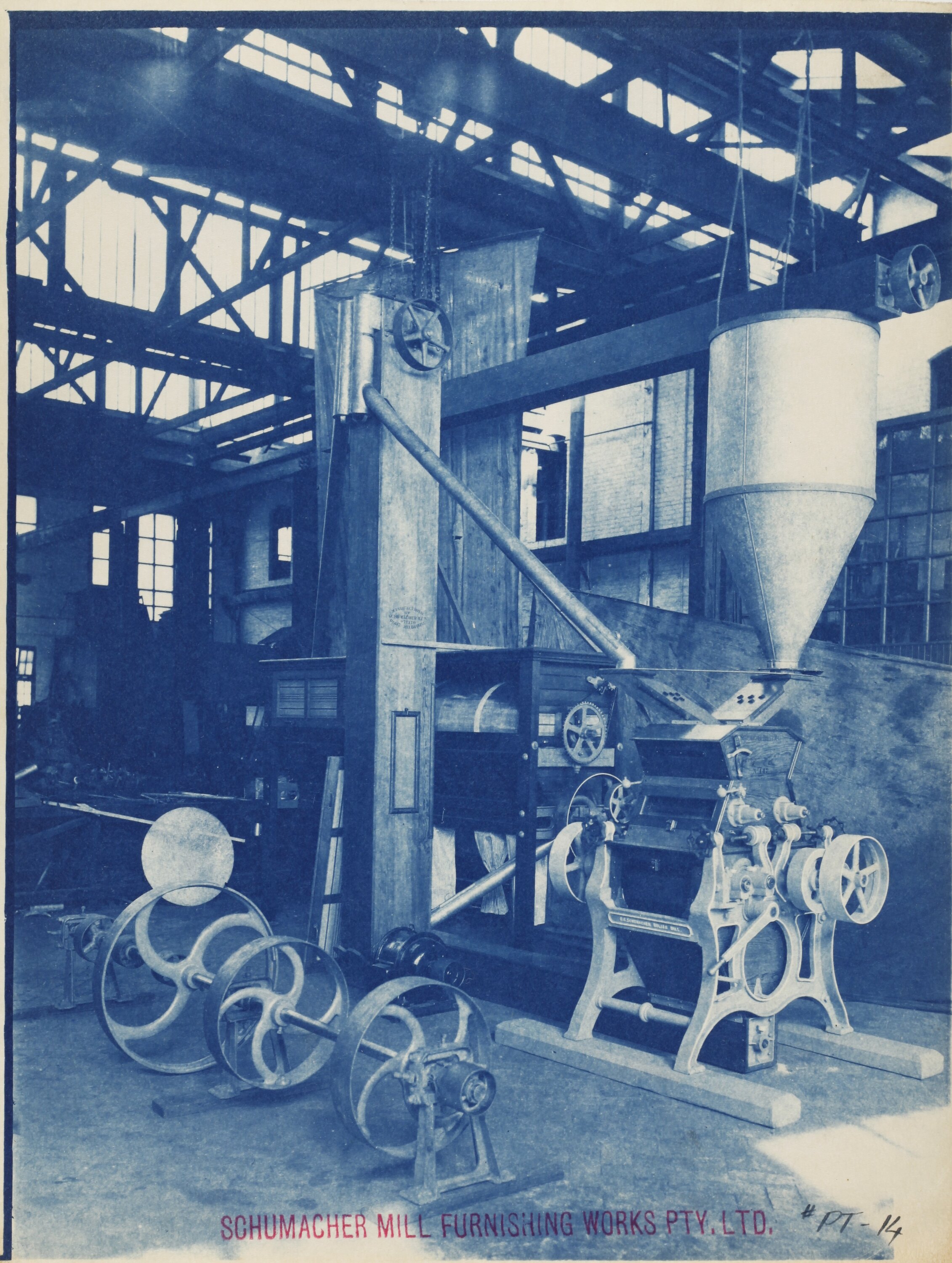 Cyanotype image depicting industrial food processing machinery. It is part of a collection of photographs and marked printer's copy used in the preparation of trade literature promoting products manufactured by the Schumacher Mill Furnishing Works Pty Ltd. The items were originally housed in a wooden filing drawer, with many filed by subject. This photograph was previously filed under 'Roller Mill With Dresser'.
