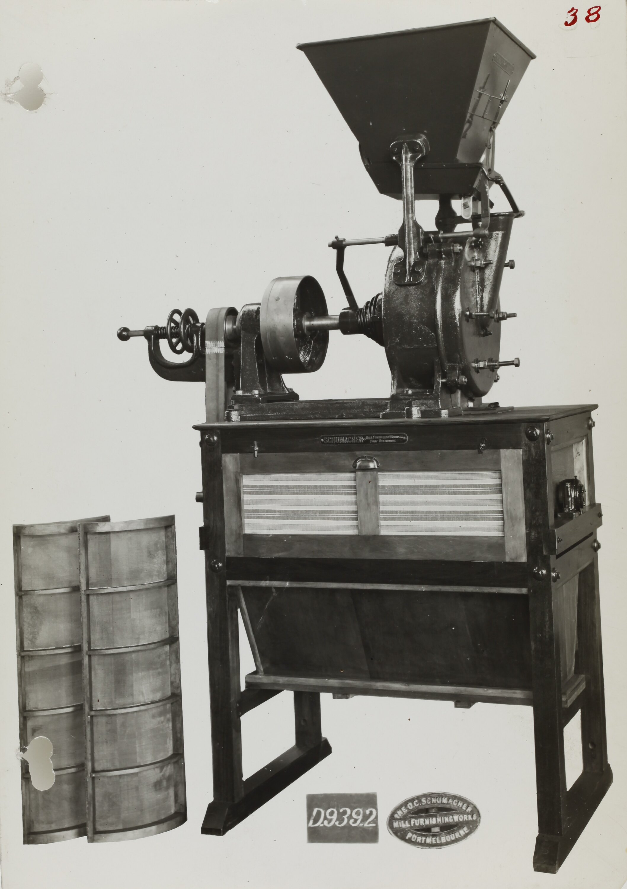 The Schumacher Mill Furnishing Works of Port Melbourne was established by the German-born American immigrant Otto Charles Schumacher around 1890. Operating initially under the name Otto C. Schumacher, the firm specialised in the importation, manufacture, installation and repair of flourmilling equipment, especially the newer style roller flour grinding machines, and associated equipment such as flour sifters, pollard and bran extractors, dust collectors, grain elevators and bag fillers. The business was formally registered as the Schumacher Mill Furnishing Works Pty Ltd in 1910. In later years the firm diversified into the manufacture of grain grading machinery for farmers and more general manufacturing equipment such as grinding mills, conveyors and packaging machinery.