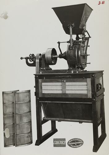 Black and white promotional image of a sifting machine. It is part of a collection of photographs and marked printer's copy used in the preparation of trade literature promoting products manufactured by the Schumacher Mill Furnishing Works Pty Ltd. The items were originally housed in a wooden filing drawer, with many filed by subject. This photograph was previously filed under 'Iris With Sifter'.
