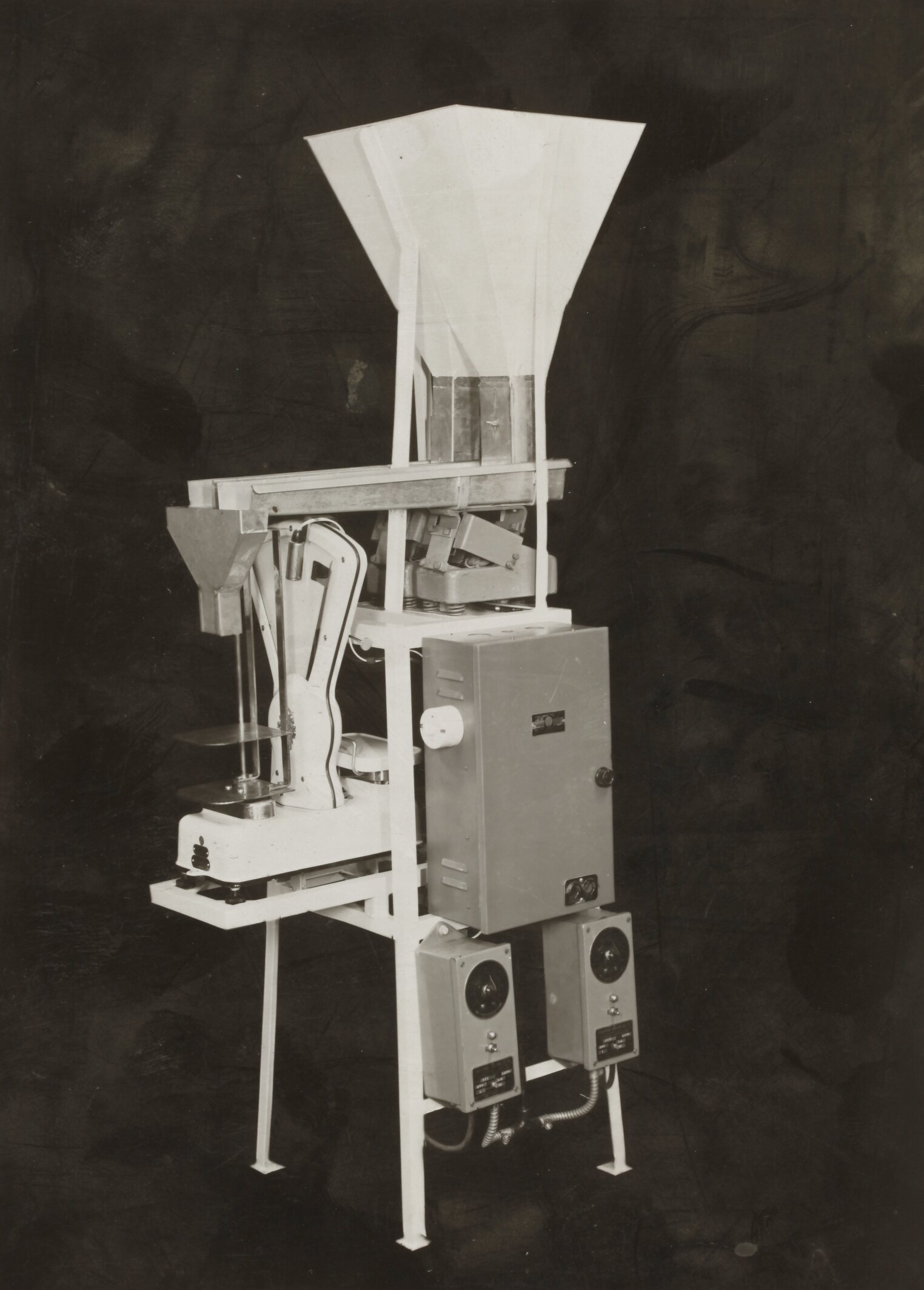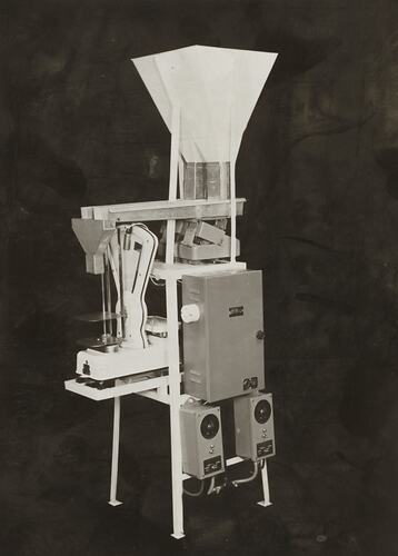Black and white promotional image of a machine. It is part of a collection of photographs and marked printer's copy used in the preparation of trade literature promoting products manufactured by the Schumacher Mill Furnishing Works Pty Ltd. The items were originally housed in a wooden filing drawer, with many filed by subject. This photograph was previously filed under 'MISC'.