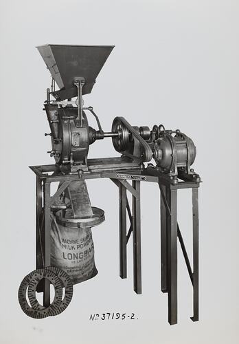 Black and white promotional image of a sifting machine. It is part of a collection of photographs and marked printer's copy used in the preparation of trade literature promoting products manufactured by the Schumacher Mill Furnishing Works Pty Ltd. The items were originally housed in a wooden filing drawer, with many filed by subject. This photograph was previously filed under 'Iris With Sifter'.