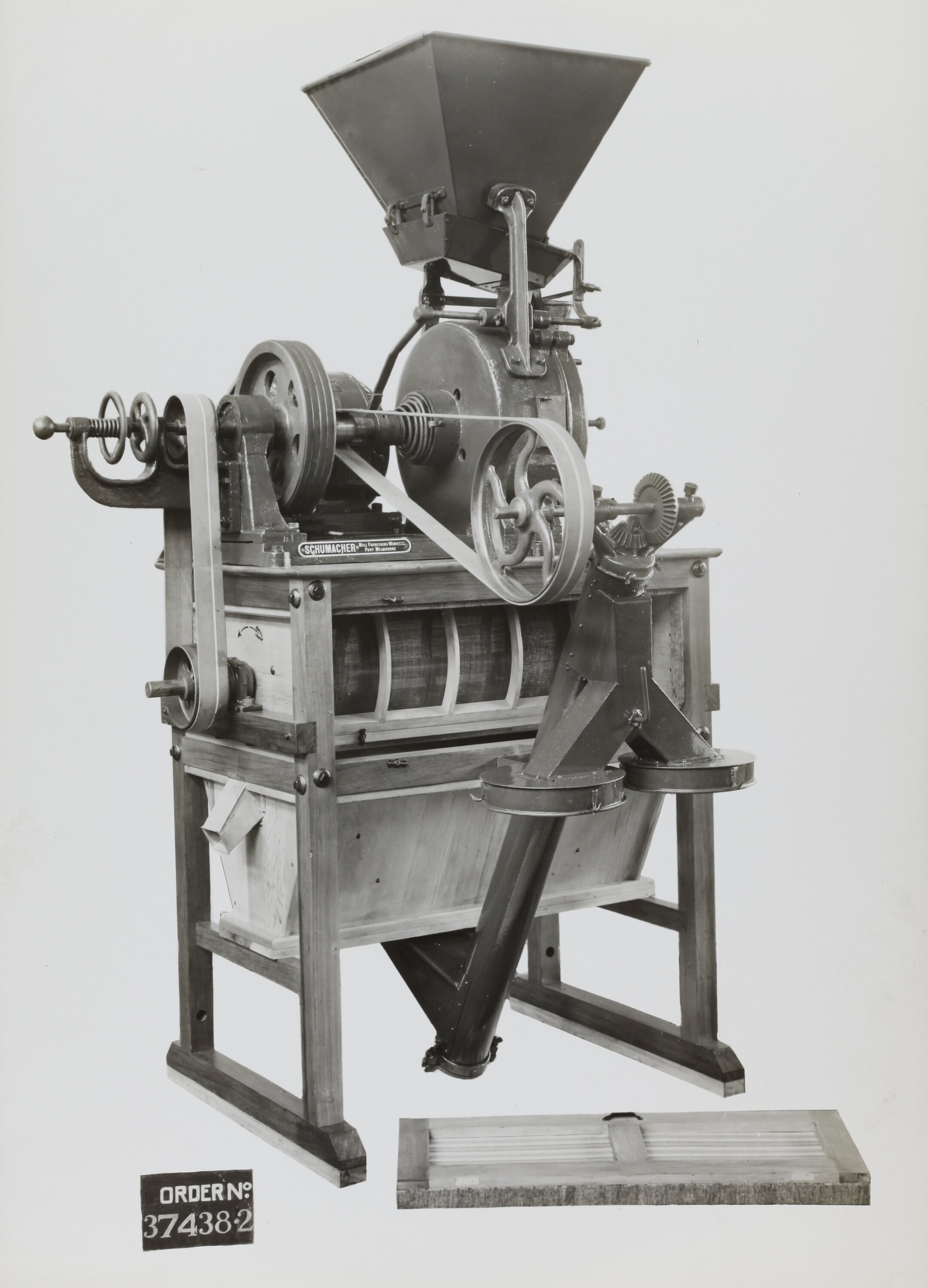 The Schumacher Mill Furnishing Works of Port Melbourne was established by the German-born American immigrant Otto Charles Schumacher around 1890. Operating initially under the name Otto C. Schumacher, the firm specialised in the importation, manufacture, installation and repair of flourmilling equipment, especially the newer style roller flour grinding machines, and associated equipment such as flour sifters, pollard and bran extractors, dust collectors, grain elevators and bag fillers. The business was formally registered as the Schumacher Mill Furnishing Works Pty Ltd in 1910. In later years the firm diversified into the manufacture of grain grading machinery for farmers and more general manufacturing equipment such as grinding mills, conveyors and packaging machinery.