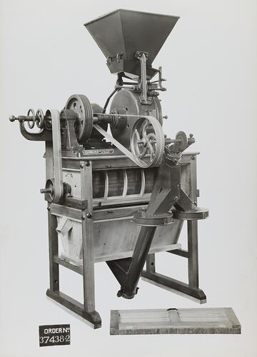 Black and white promotional image of a sifting machine. It is part of a collection of photographs and marked printer's copy used in the preparation of trade literature promoting products manufactured by the Schumacher Mill Furnishing Works Pty Ltd. The items were originally housed in a wooden filing drawer, with many filed by subject. This photograph was previously filed under 'Iris With Sifter'.