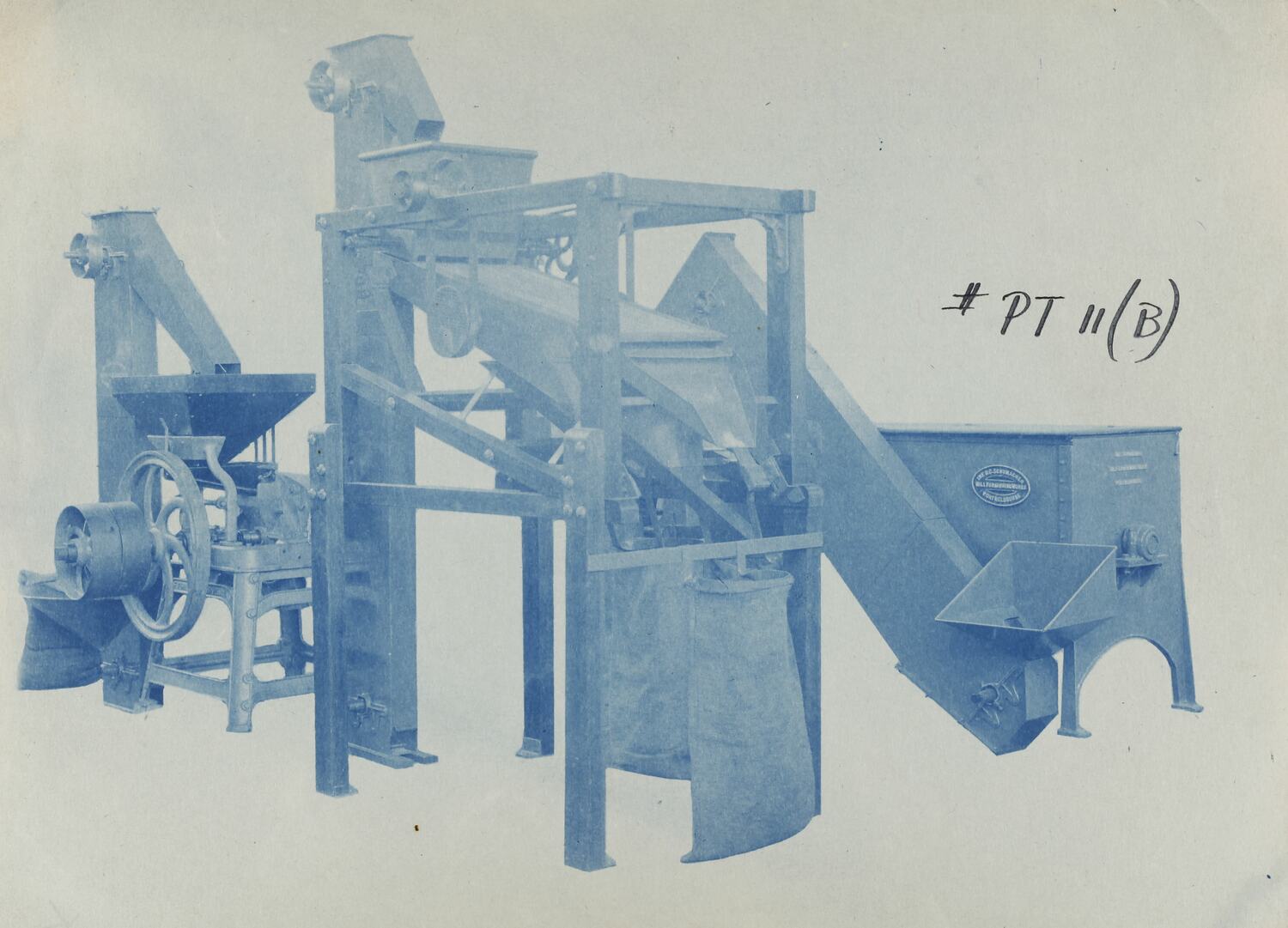 Cyanotype promotional image of a self contained plant. It is part of a collection of photographs and marked printer's copy used in the preparation of trade literature promoting products manufactured by the Schumacher Mill Furnishing Works Pty Ltd. The items were originally housed in a wooden filing drawer, with many filed by subject. This photograph was previously filed under 'Iris With Sifter'.