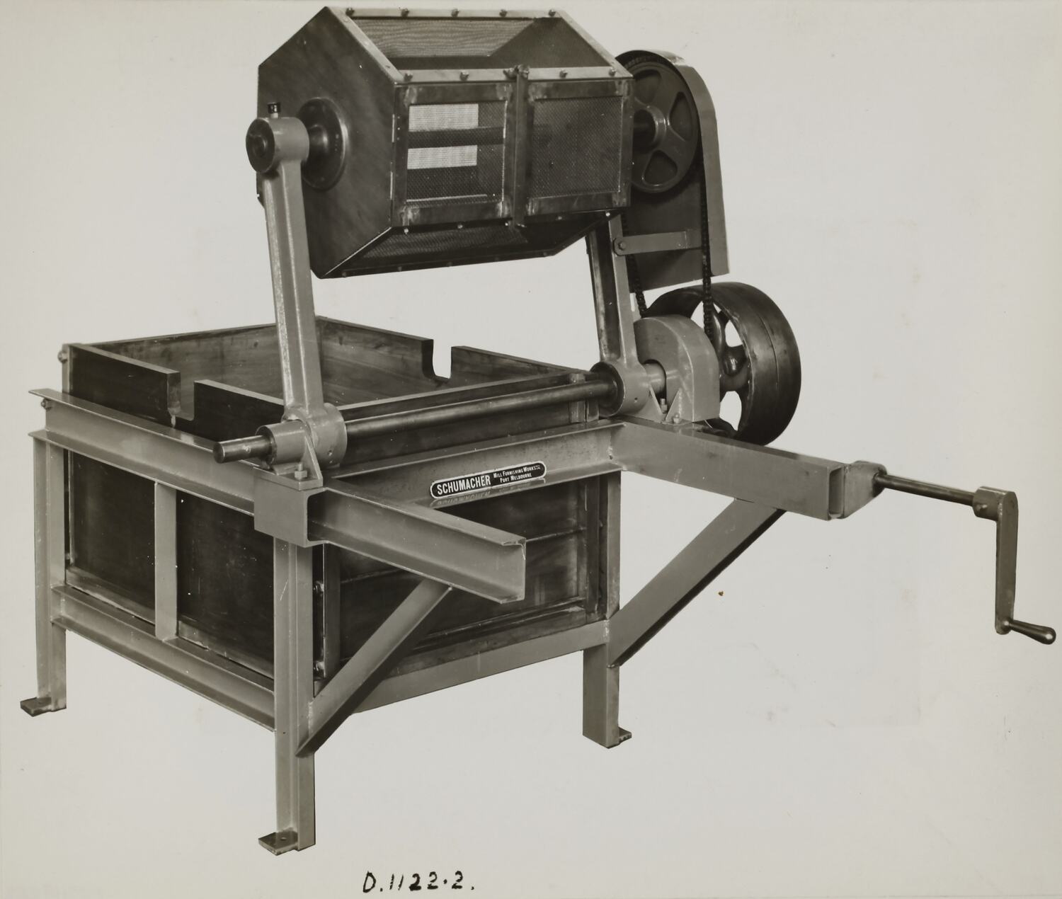Printed on the front of photograph: 'D.1122-2.' Printed in black ink on cream label attached to back of photograph: 'From / Schumacher Mill Furnishing Works / PROPRIETARY LIMITED. / ONE ONLY LIQUID CLEANING RUMBLER, / INCLUSIVE OF PULLEY DRIVEN COUNTER- / SHAFT AND TIP-OVER ASSEMBLY - - / Supplied to IMPERIAL CHEMICAL / INDUSTRIES, DEER PARK - O.N.39521 - / 26/3/40. / PORT MELBOURNE, / VICTORIA.' Printed in purple ink on back of photograph: 'Kerr / BROS. / COMMERCIAL / PHOTOGRAPHERS / 533 COLLINS ST. MELBOURNE' Printed in red ink on back of photograph: PHOTO FILE NO. / SECTION NO.' Handwritten in grey pencil on the back of photograph: '14' Handwritten in red pencil on the back of photograph: 'OFFICE COPY'