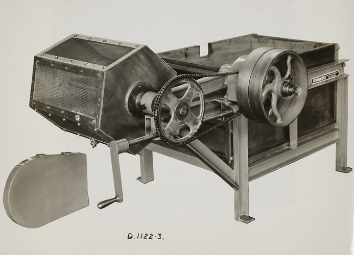 Printed on the front of photograph: 'D.1122-3.' Printed in black ink on cream label attached to back of photograph: 'Photo D.1122.3 Rumbling type Washing / Machine and provision for further / rumbling with saw-dust added for / drying purposes, suitable for brass / parties etc. / From / Schumacher Mill Furnishing Works / PROPRIETARY LIMITED. / ONE ONLY LIQUID CLEANING RUMBLER, / INCLUSIVE OF PULLEY DRIVEN COUNTER- / SHAFT AND TIP-oVER ASSEMBLY - - / Supplied to IMPERIAL CHEMICAL / INDUSTRIES, DEER PARK - O.N.39521 - / 26/3/40. / PORT MELBOURNE, / VICTORIA.' Printed in purple ink on back of photograph: 'Kerr / BROS. / COMMERCIAL / PHOTOGRAPHERS / 533 COLLINS ST. MELBOURNE' Handwritten in red pencil on the back of photograph: 'OFFICE Copy'