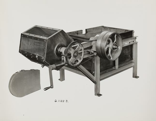 Black and white promotional image of a liquid cleaning rumbler. It is part of a collection of photographs and marked printer's copy used in the preparation of trade literature promoting products manufactured by the Schumacher Mill Furnishing Works Pty Ltd. The items were originally housed in a wooden filing drawer, with many filed by subject. This photograph was previously filed under 'CARTRIDGE - CASE WASHERS'.