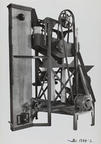 Black and white promotional image of a No 1A spice grinder hercules mill. It is part of a collection of photographs and marked printer's copy used in the preparation of trade literature promoting products manufactured by the Schumacher Mill Furnishing Works Pty Ltd. The items were originally housed in a wooden filing drawer, with many filed by subject. This photograph was previously filed under 'Herc With Sifter'.