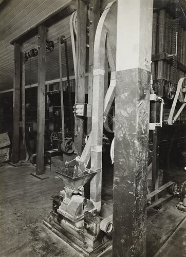 Black and white image depicting a grinding and dressing plant. It is part of a collection of photographs and marked printer's copy used in the preparation of trade literature promoting products manufactured by the Schumacher Mill Furnishing Works Pty Ltd. The items were originally housed in a wooden filing drawer, with many filed by subject. This photograph was previously filed under 'Pulverizer & Interceptor'.
