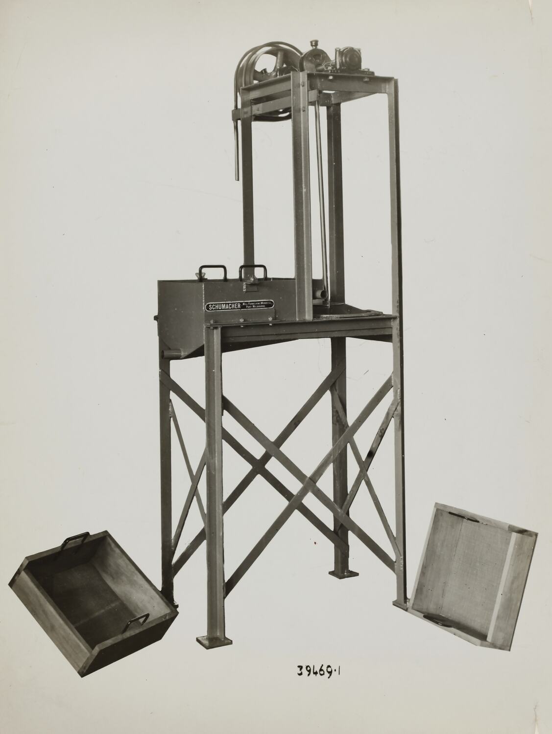 Black and white promotional image of a special jig for a granulating machine. It is part of a collection of photographs and marked printer's copy used in the preparation of trade literature promoting products manufactured by the Schumacher Mill Furnishing Works Pty Ltd. The items were originally housed in a wooden filing drawer, with many filed by subject. This photograph was previously filed under 'CARTRIDGE - CASE WASHERS'.