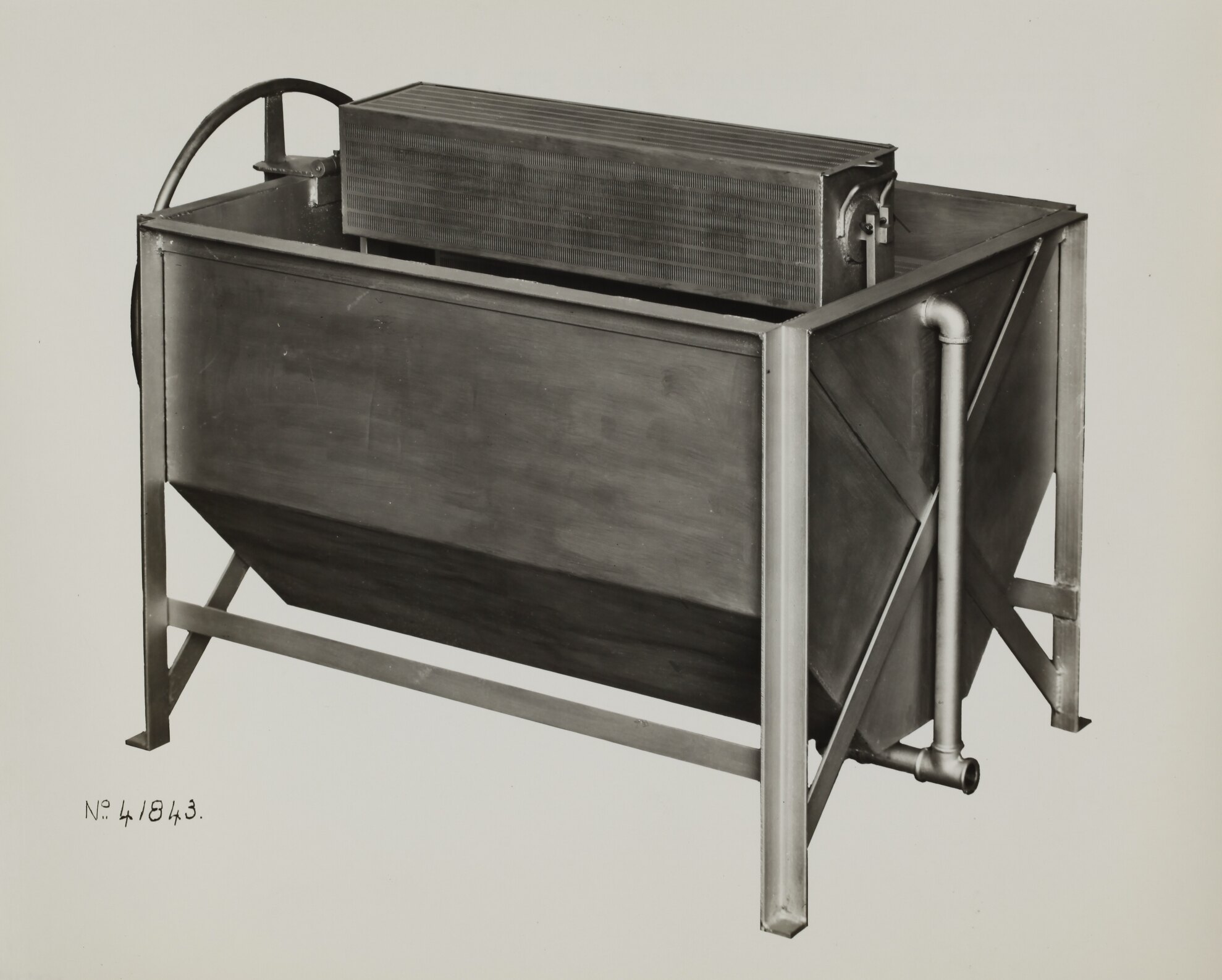 Black and white promotional image of a machine. It is part of a collection of photographs and marked printer's copy used in the preparation of trade literature promoting products manufactured by the Schumacher Mill Furnishing Works Pty Ltd. The items were originally housed in a wooden filing drawer, with many filed by subject. This photograph was previously filed under 'CARTRIDGE - CASE WASHERS'.