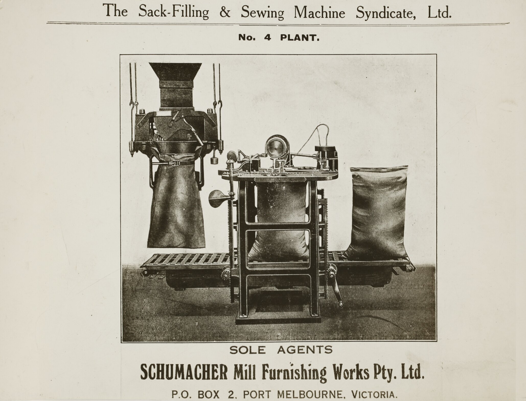 Black and white promotional image of a sack-filling & sewing machine syndicate. It is part of a collection of photographs and marked printer's copy used in the preparation of trade literature promoting products manufactured by the Schumacher Mill Furnishing Works Pty Ltd. The items were originally housed in a wooden filing drawer, with many filed by subject. This photograph was previously filed under 'MISC'.