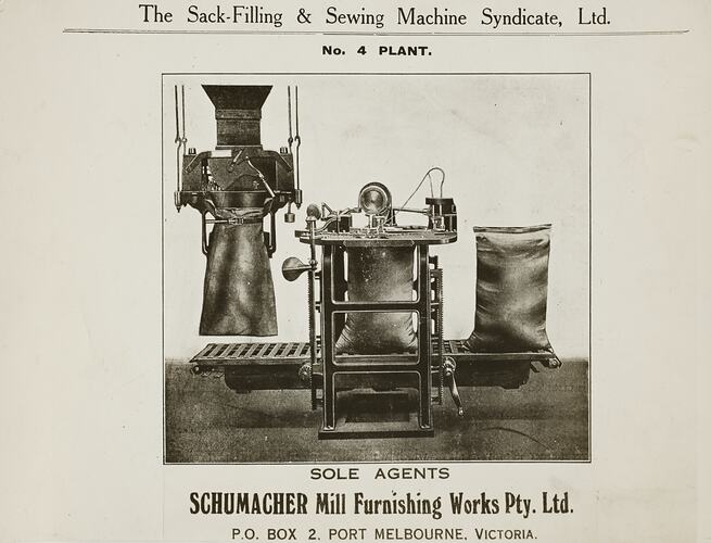 Printed on the front of photograph: 'The Sack Filling & Sewing Machine Syndicate, Ltd. / No 4 PLANT. / SOLE AGENTS / SCHUMACHER Mill Furnishing Works Pty. Ltd. / P.O. BOX 2. PORT MELBOURNE, VICTORIA' Printed in red ink on back of photograph: 'PHOTO FILE NO. / SECTION NO.' Handwritten in grey pencil on the back of photograph: '4 / 8-D' Handwritten in red pencil on the back of photograph: 'OFFICE Copy'