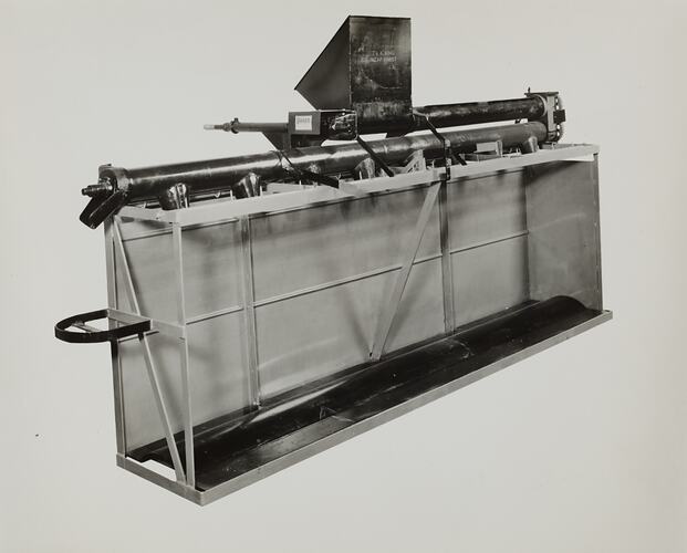 Black and white promotional image of a machine. It is part of a collection of photographs and marked printer's copy used in the preparation of trade literature promoting products manufactured by the Schumacher Mill Furnishing Works Pty Ltd. The items were originally housed in a wooden filing drawer, with many filed by subject. This photograph was previously filed under 'BAGGERS'.