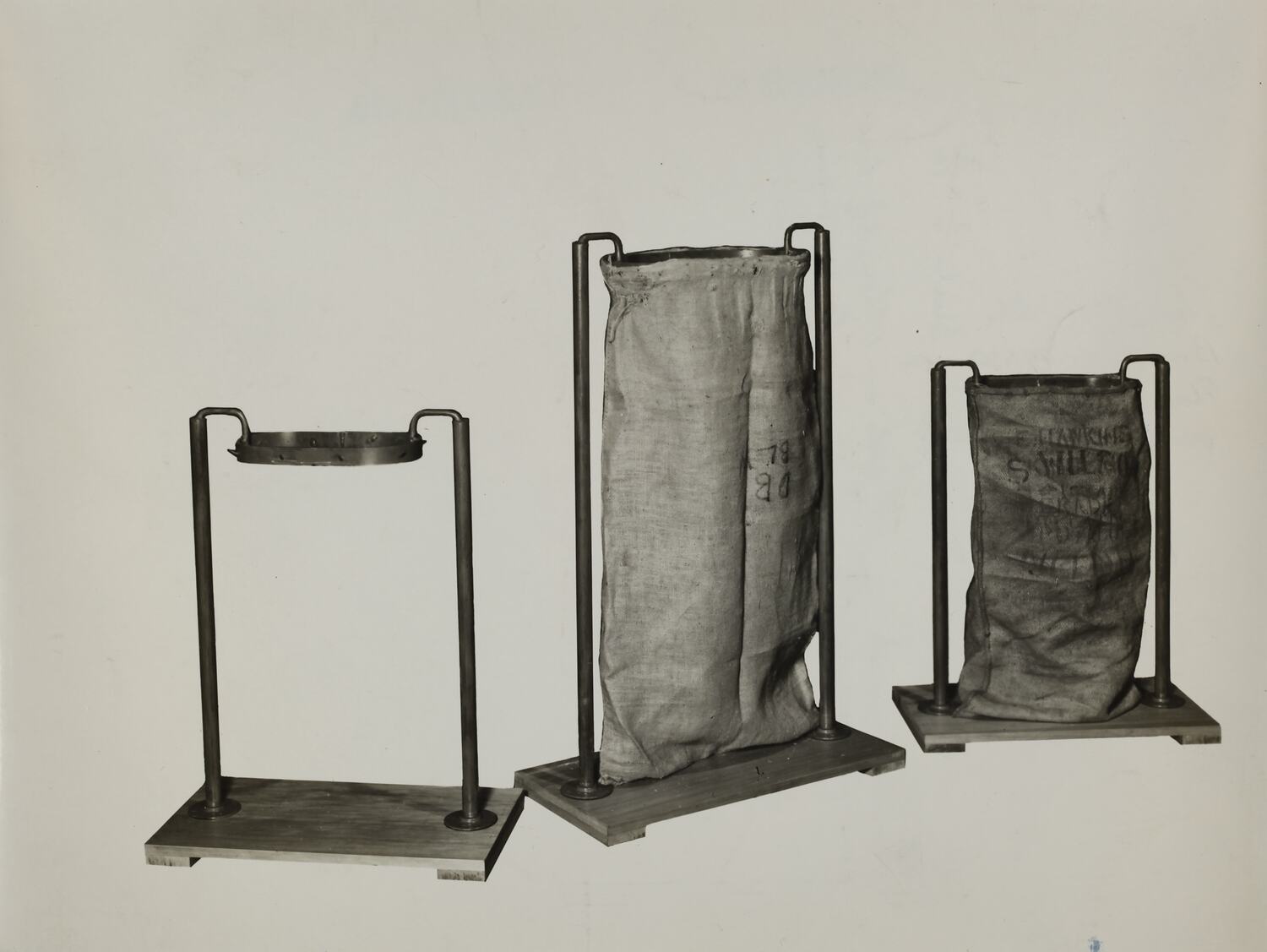 Printed in purple ink on back of photograph: 'Kerr / BROS. / COMMERCIAL / PHOTOGRAPHERS / 533 COLLINS ST. MELBOURNE' Printed in green ink on back of photograph: 'SCHUMACHER MILL FURNISHING WORKS PTY. LTD.' Handwritten in grey pencil on back of photograph: 'This will take / Bran bags 49x30 / Flour " 41x23" / and others / Price 6.12.6 / 8.1.41 / [extended text]'