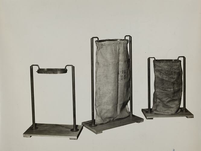 Black and white promotional image of bagging equipment. It is part of a collection of photographs and marked printer's copy used in the preparation of trade literature promoting products manufactured by the Schumacher Mill Furnishing Works Pty Ltd. The items were originally housed in a wooden filing drawer, with many filed by subject. This photograph was previously filed under 'BAGGERS'.