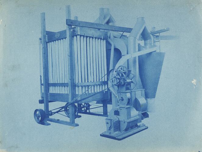 Cyanotype promotional image of a grinding machine with filter. It is part of a collection of photographs and marked printer's copy used in the preparation of trade literature promoting products manufactured by the Schumacher Mill Furnishing Works Pty Ltd. The items were originally housed in a wooden filing drawer, with many filed by subject. This photograph was previously filed under 'Pulv. Coll. & Filter'.
