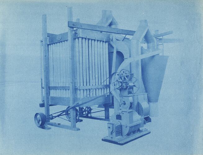 Cyanotype promotional image of a grinding machine with filter. It is part of a collection of photographs and marked printer's copy used in the preparation of trade literature promoting products manufactured by the Schumacher Mill Furnishing Works Pty Ltd. The items were originally housed in a wooden filing drawer, with many filed by subject. This photograph was previously filed under 'Pulv. Coll. & Filter'.
