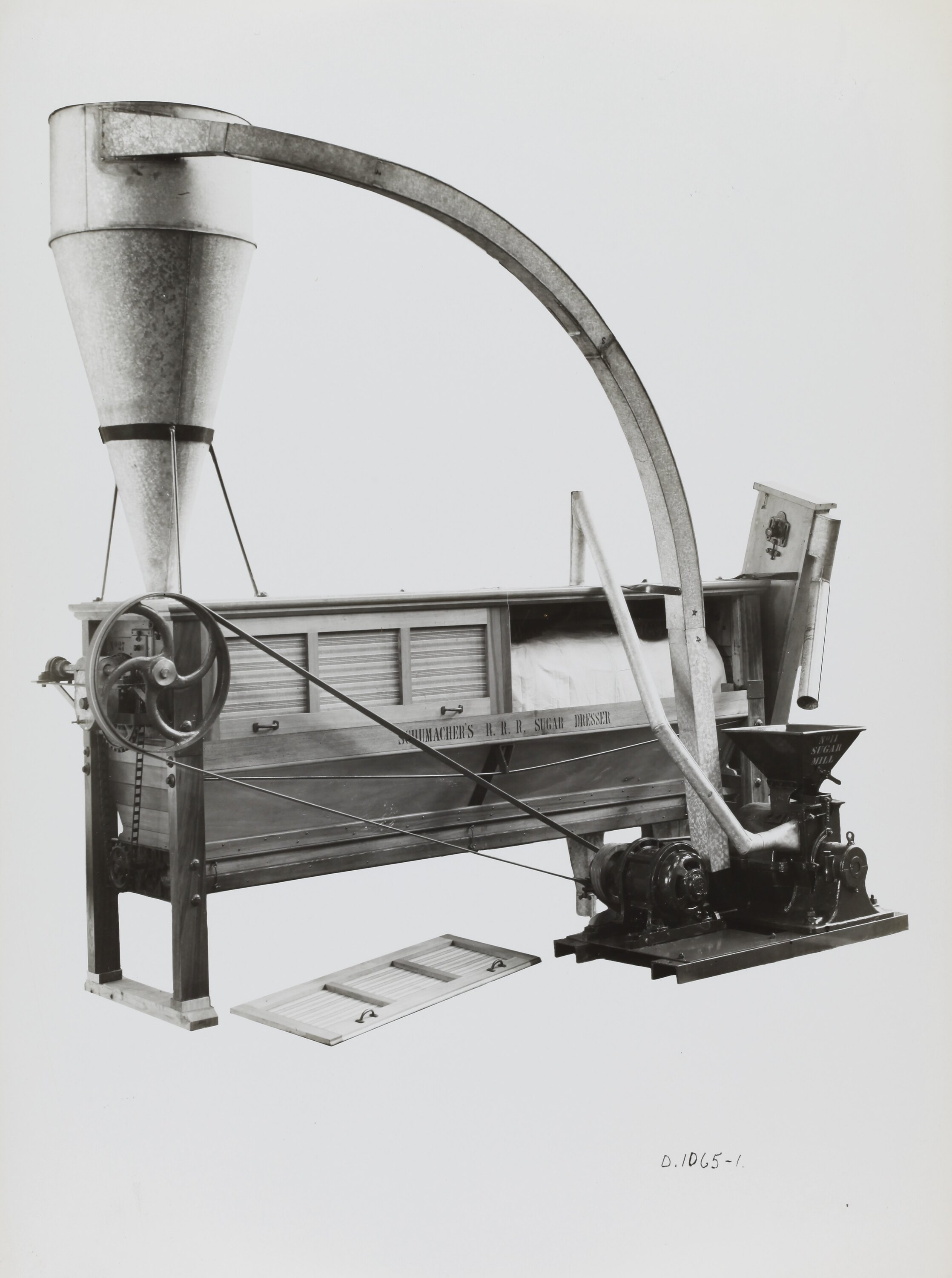 Black and white promotional image of a number eleven size self contained icing and castor sugar plant. It is part of a collection of photographs and marked printer's copy used in the preparation of trade literature promoting products manufactured by the Schumacher Mill Furnishing Works Pty Ltd. The items were originally housed in a wooden filing drawer, with many filed by subject. This photograph was previously filed under 'Pulv. Coll & Dresser'.