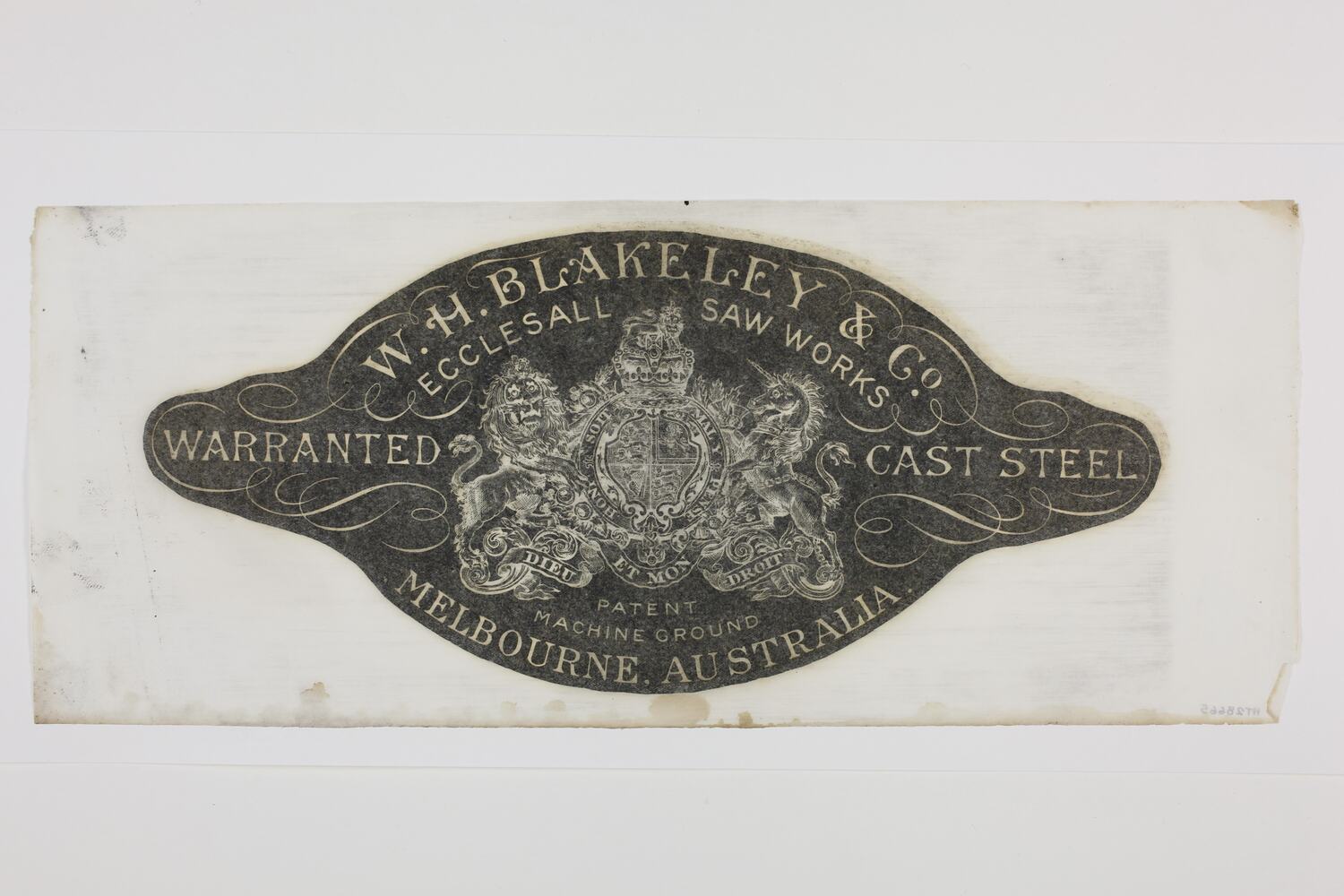 'W.H. BLAKELEY & CO. / ECCLESALL SAW WORKS / WARRANTED CAST STEEL / PATENT / MACHINE GROUND / MELBOURNE, AUSTRALIA.' On coat of arms: 'HONI SOIT / MAL Y PENSE / DIEU ET MON DROIT'.