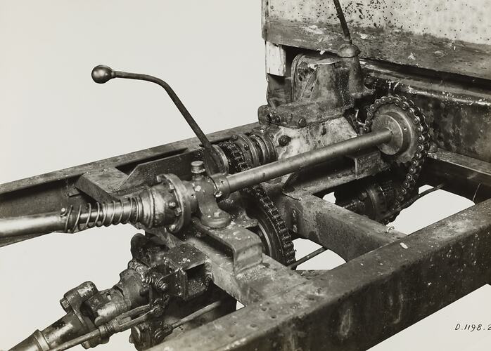 Printed on the front of photograph: 'D.1198.2' Printed in black ink on back of photograph: 'Kerr / BROS. / COMMERCIAL / PHOTOGRAPHERS / 533 COLLINS ST. MELBOURNE' Printed in black ink on cream label attached to back of photograph: 'From / Schumacher Mill Furnishing Works / PROPRIETARY LIMITED. / PORT MELBOURNE, / VICTORIA.' Handwritten in black ink on cream label attached to back of photograph: 'Gear Reduction attached to / Trench Digging Elevator - / ON.41055 - 27/6/41.' Handwritten in red pencil on the back of photograph: 'OFFICE / COPY'