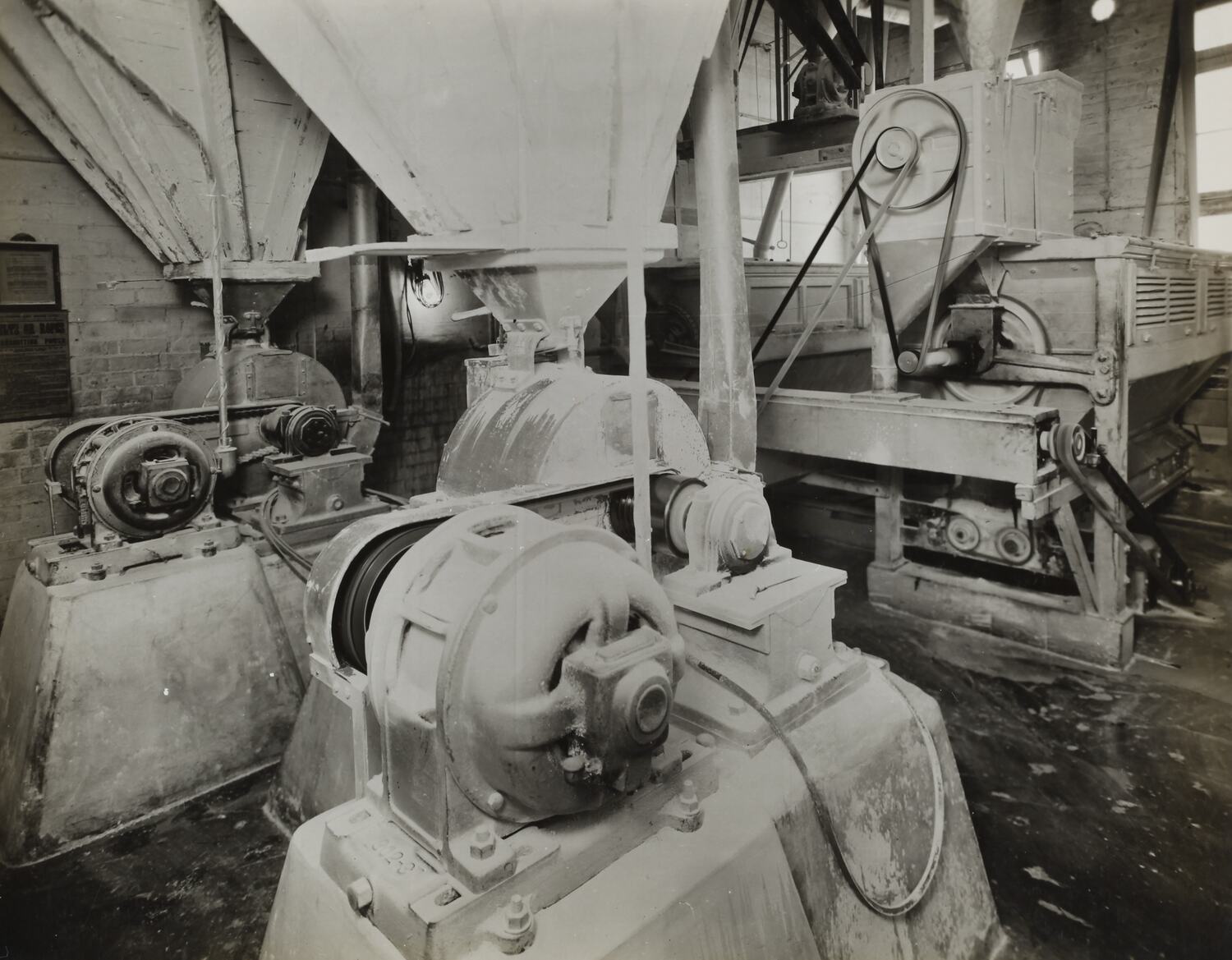 Black and white image depicting industrial machinery. It is part of a collection of photographs and marked printer's copy used in the preparation of trade literature promoting products manufactured by the Schumacher Mill Furnishing Works Pty Ltd. The items were originally housed in a wooden filing drawer, with many filed by subject. This photograph was previously filed under 'Pulverizer and Collector'.